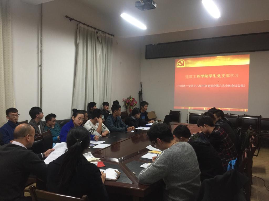 11月3日下午,建筑工程学院学生党支部于会议室召开专题学习会,学习传达党的十八届六中全会精神。会议由院党总支副书记、学生支部书记付旭主持,学生支部全体党员、积极分子参与了本次学习会。