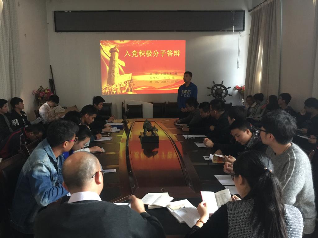11月3日,建筑工程学院学生党支部在学院会议室举行活动,对列入培养对象的18位入党积极分子进行了党的知识、入党动机等的答辩活动。活动由院党总支副书记、学生党支部书记付旭主持,院党总支书记陈兴军观摩了活动。学生党支部31名党员作为评委参加了此次答辩。