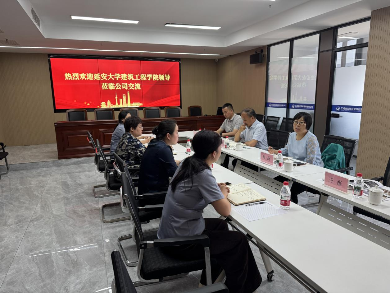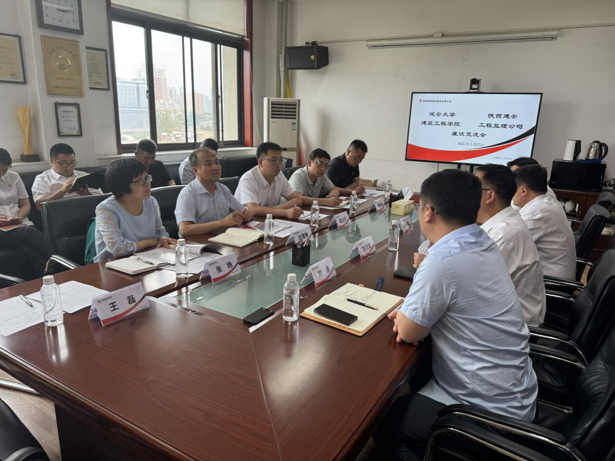 本网讯 5月27日下午,建筑工程学院一行来到陕西建安工程监理有限公司走访调研并举行座谈交流会。公司董事长刘文龙、总经理徐一真、副总经理刘康、郝亮及各部门负责人;建工学院党委书记赵耀锋、副院长霍治澎、张扬及教师代表参加活动。刘文龙围绕企业概况、团队建设、人才培养等方面进行了介绍,希望在岗位需求、资源互通等方面与我校建立长期稳定的合作关系。赵耀锋介绍了本次访企拓岗的背景、目的及学院基本情况,希望双方创新合作方式,拓展实习就业岗位,在新机遇下共建人才培养共同体,造就合作发展新局面。与会人员就实践教学、科学研究、就业实习、职业规划等方面进行了互动交流。