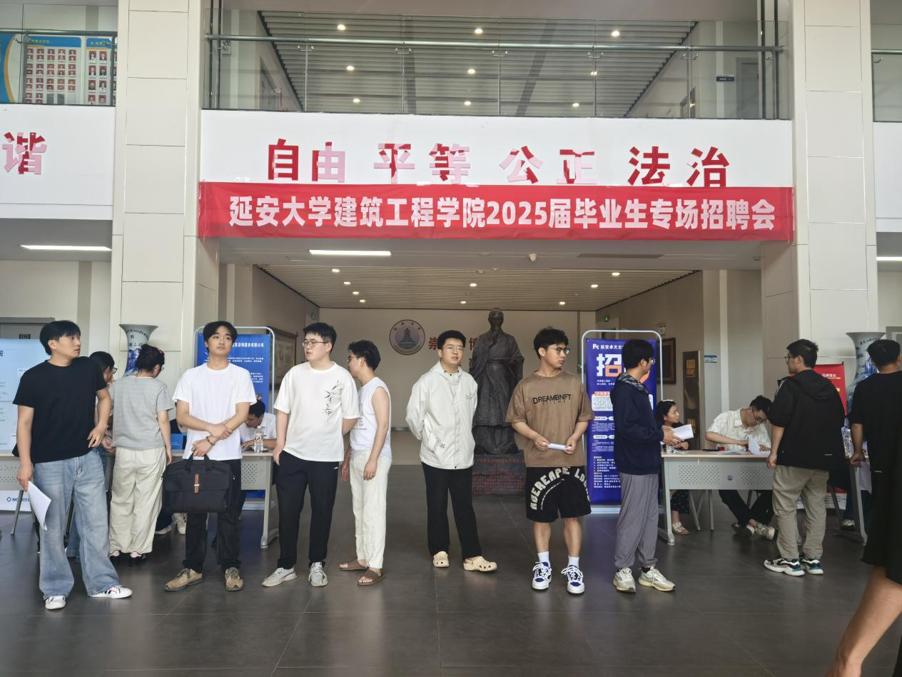 本网讯 为落实“百日冲刺”就业专项行动,把握毕业季就业关键期,5月29日下午,建筑工程学院在学院一楼大厅举办了2025届毕业生专场招聘会。来自延安市的28家企业参与了招聘,学院党政领导班子成员以及全体辅导员、班主任、参加了此次招聘会。