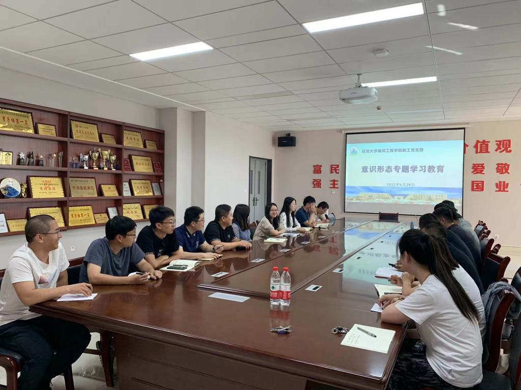 本网讯 6月28日下午,建筑工程学院教工党支部在学院会议室召开了意识形态专题教育会,全体教工党员参加了学习教育活动。会议由教工党支部书记张扬主持。