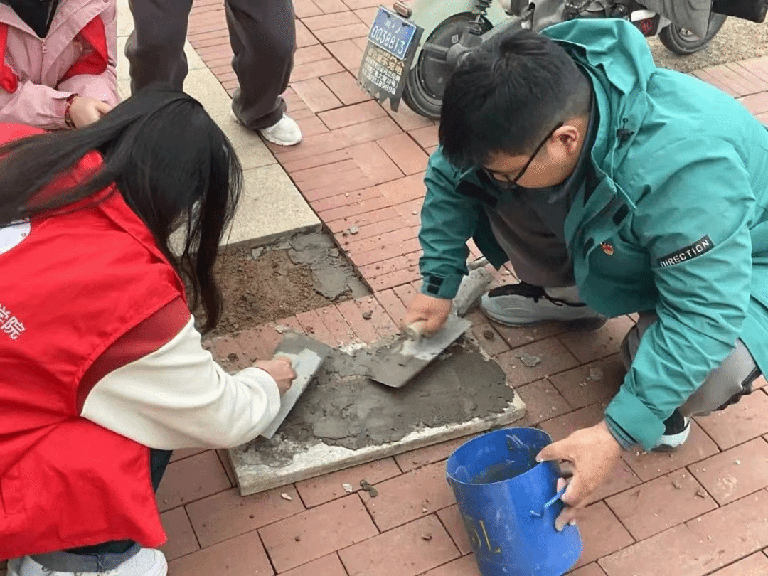 本次志愿活动分为两部分,前期通过微信推送向广大师生、后勤工作人员征集需要修缮处,学生志愿者将信息收集整理;活动当日,专业课教师、辅导员、学生党员、团员同学携带工具、水泥对校园破损的台阶、石板、砖块等进行修缮处理,将课堂知识应用于校园建设中,同学们充满了干劲和自豪感。