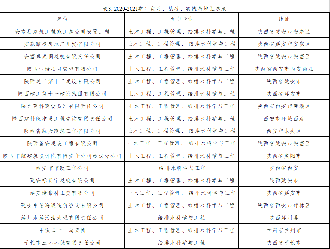 2014年开始,我们采取分散与集中结合的生产实习模式,利用教师的各种人际关系,在延安市及周边地区每年联系10个左右实习单位,选择一部分自己愿意去的同学在指导老师的带领下有组织地实习,其余学生仍采取自愿。2020-2021学年,为学生提供广阔的实践平台,我院共有实践基地18个,见表3所示。通过实习见习,学生实践动手能力明显提高,毕业后进入工作岗位的适应期也明显缩短。在2014年以来,全球就业市场下滑的形势下,我院土木工程、工程管理专业毕业生的一次就业率仍保持在90%以上,名列学校前列。